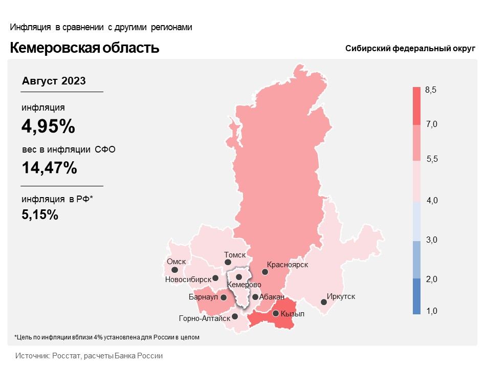 Годовая инфляция в Кемеровской области в августе составила практически 5% после 3,9% в июле. Это по-прежнему ниже, чем в среднем по Сибири и по России.