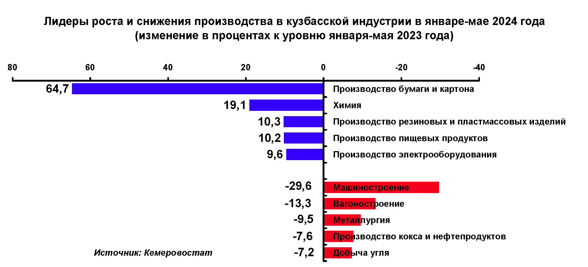 Лидерами сокращения производства, по данным Кемеровостата, выступают из крупных отраслей машиностроение (на 29,6% за пять месяцев текущего года), вагоностроение (на 13,3%), металлургия (на 9,5%), производство кокса и нефтепродуктов (на 7,6%), углепром (на 7,2%), ремонт и монтаж машин/оборудования (на 6,8%).
