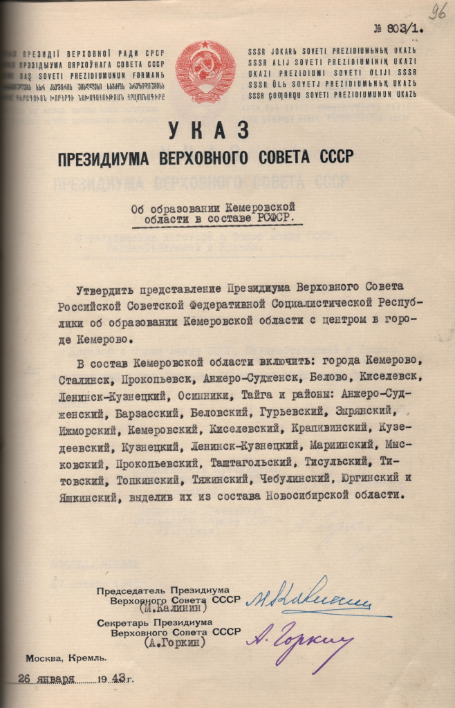 80 лет назад, 26 января 1943 года, Указом Президиума Верховного Совета СССР была образована Кемеровская область. В состав образованной области вошли города и районы, выделенные из территории Новосибирской области.