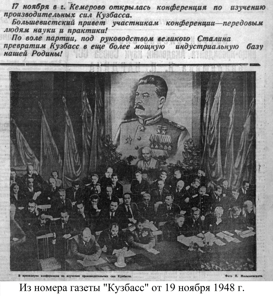 Конференция по изучению производительных сил Кузбасса открылась 17 ноября 1948 года. Газета «Кузбасс» сообщала: «Более шестисот участников конференции заполнили зал областного драматического театра» (в 1948 году театр находился во Дворце труда, здание которого сегодня занимает Кузбасский колледж культуры и искусств).