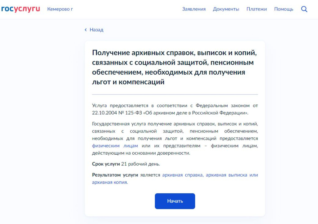 Информируем Вас о том, что в настоящее время обращения на получение архивных справок, выписок, копий, связанных с социальной защитой, пенсионным обеспечением, необходимых для получения льгот и компенсаций можно оформить в электронном виде через ГОСУСЛУГИ, пройдя по ссылке https://www.gosuslugi.ru/600149/1/form