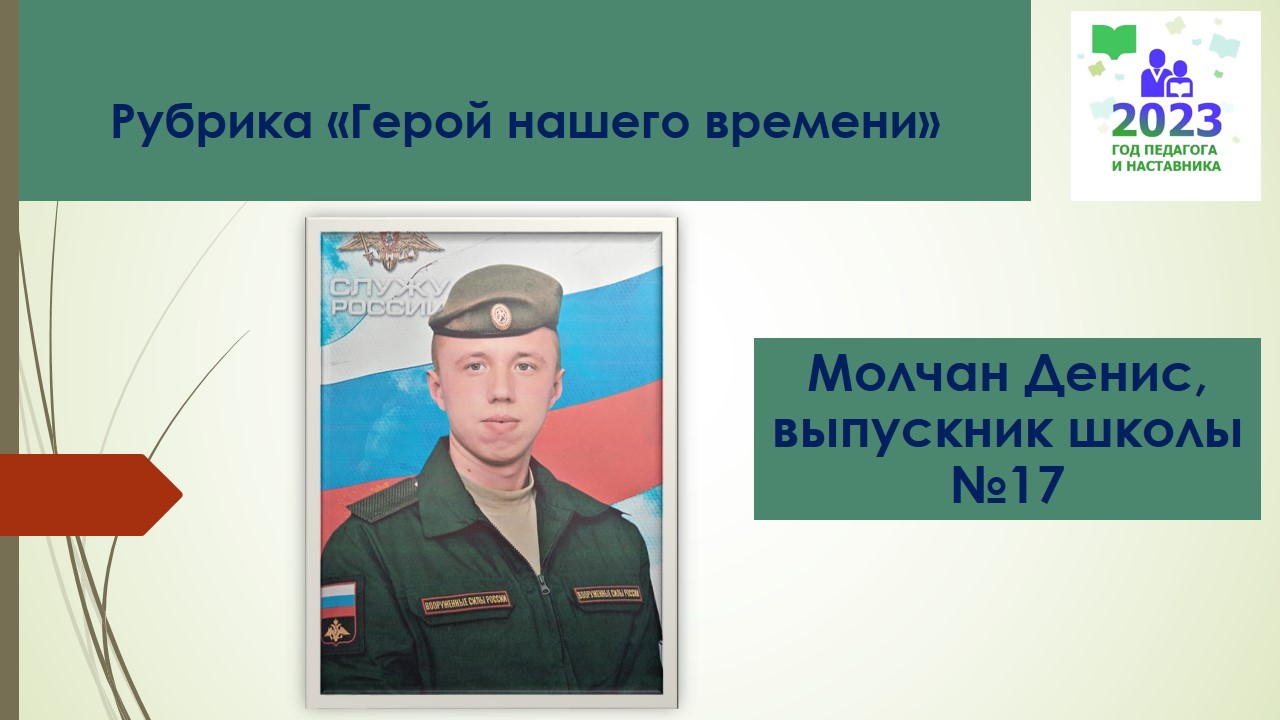 Молчан Денис с первого класса обучался в МБОУ «ООШ № 17». Кого бы вы ни спросили, уверенно ответит: он был лучшим, добрым, открытым, спокойным. Человеком, в котором порядочность и интеллигентность были буквально врожденные. Денис — тот редкий человек, для кого справедливость и право — камертон решений и поступков. Окончив школу, поступил учиться в Анжеро-Судженский педагогический колледж, после окончания которого был призван в вооруженные силы РФ. Служил в звании матроса, был пулеметчиком отделения морской пехоты.