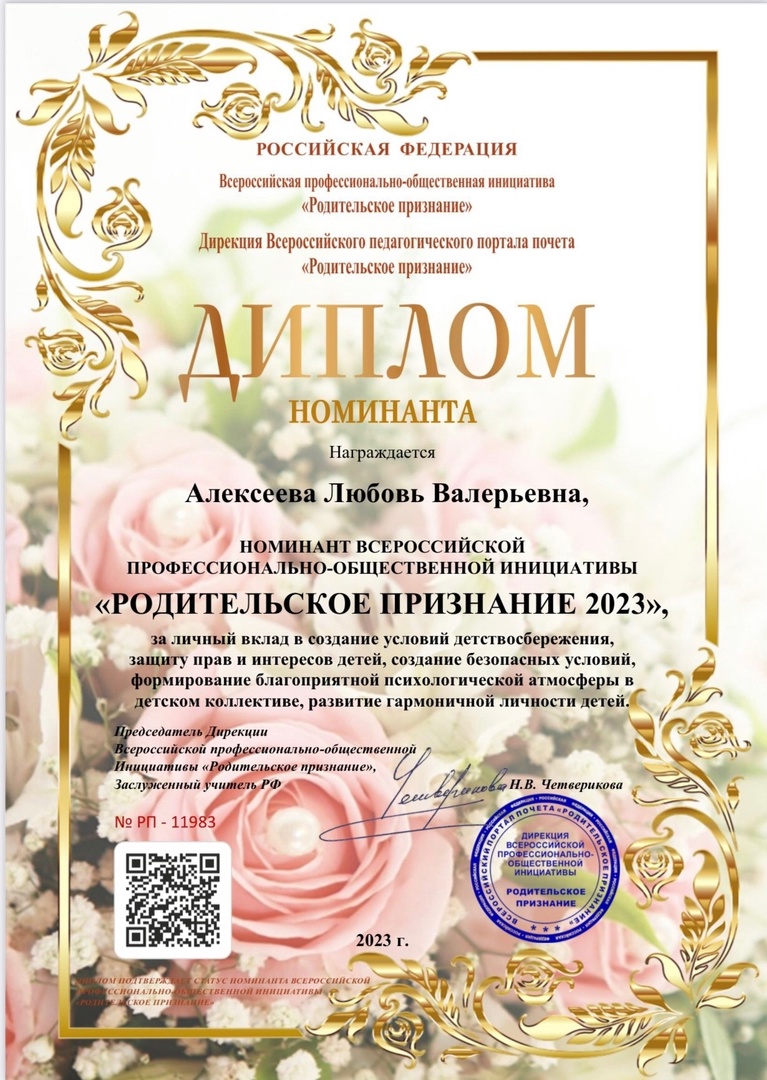 Миссия Года – признание особого статуса педагогических работников, в том числе выполняющих наставническую деятельность. Мероприятия Года педагога и наставника направлены на повышение престижа профессии учителя, воспитателя. Профессионально-общественная Инициатива «Родительское признание 2023» - это социально-ориентированный некоммерческий проект, направленный на популяризацию деятельности педагогов России, публичное признание важности вклада педагогов в развитие детей. В 2023 году все родители дошкольников и школьников всех регионов России могут выразить свою благодарность и признание одному или нескольким педагогам, руководителям, образовательной организации (коллективу педагогов). Так, воспитатель МАДОУ ЦРР "Планета детства" Алексеева Любовь Валерьевна была удостоена награды "Родительское признание 2023".