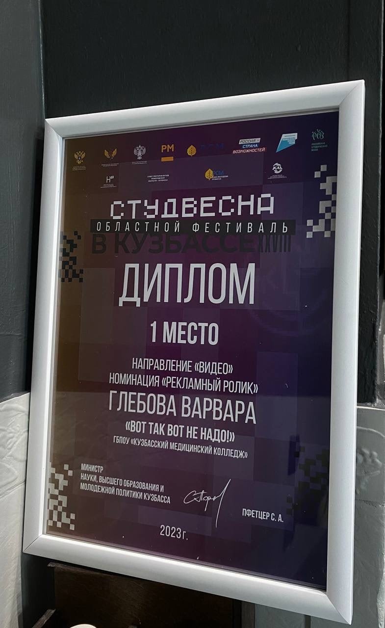 Студенка Кузбасского медицинского колледжа стала победителем в номинации «Рекламный ролик» направления «Видео» областного фестиваля непрофессионального студенческого творчества «Студенческая весна в Кузбассе».