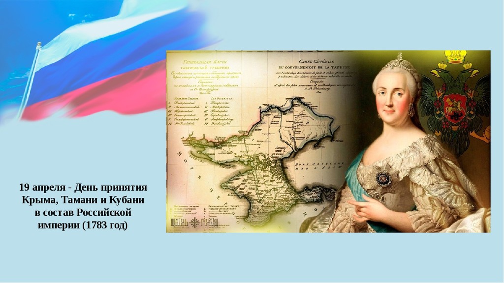 Дата 19 апреля (8 апреля по старому стилю) выбрана не случайно. Именно в этот день в 1783 году императрица Екатерина II подписала высочайший Манифест «О принятии Крымского полуострова, острова Тамана и всея Кубанской стороны под державу Российскую».