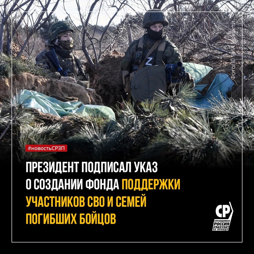 Президент РФ Владимир Путин подписал указ о создании фонда поддержки участников СВО и семей погибших бойцов. Он будет называться "Защитники Отечества". Эта идея созвучна с нашим давним предложением. Фракция "СПРАВЕДЛИВАЯ РОССИЯ – ЗА ПРАВДУ" в Государственной Думе Российской Федерации еще в прошлом году предлагала создать Фонд поддержки Вооруженных сил РФ. Мы выступали с инициативой поднять налоги для самых обеспеченных россиян, за счет которых фонд бы и пополнялся.
