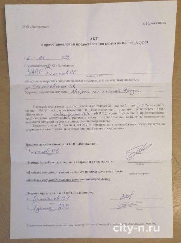 После этого мы обратились в администрацию города для решения вопроса с Водоканалом. Тем временем вода в доме №38 по ул. Стахановская отсутствует с 07.04.2023 и по настоящий момент» , - пишет наш читатель и делится фотографиями полученных от Водоканала документов.