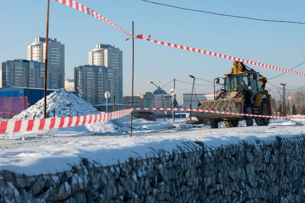 На 200-метровом продолжении набережной Томи работы не останавливаются даже зимой. Строительство идет от «Кузбасс-Арены» до границы с будущим микрорайоном «Притомский».
