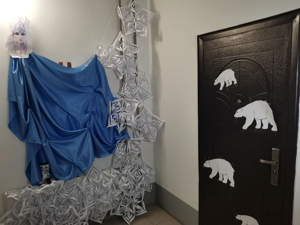 В подъезде появились нарядные ёлочки, разнообразные Деды Морозы, олени и белые медведи, снежинки и гирлянды. Жители проявили креатив. Например, сделали настенную композицию в виде новогодних часов, фотозону для самых маленьких жителей дома, одну из лестничных площадок украсила композиция, символизирующая владения Снежной Королевы.