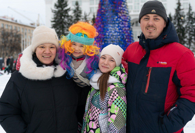 Семья Рощиных, супруги Анна и Александр, дочери Алиса и София, пришла на праздник в полном составе. Кемеровчане Рощины любят все вместе ходить на праздники и мероприятия, участвовать в конкурсах.На открытие городка девочки взяли маскарадные костюмы Бабы Яги и Кикиморы.