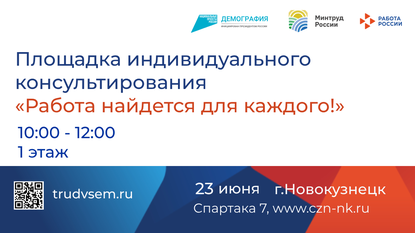 23 июня в рамках Всероссийской ярмарки вакансий с 10:00 до 12:00 в Кадровом центре "Работа России" будет работать площадка индивидуального консультирования "Работа найдется для каждого", Вас ждет: