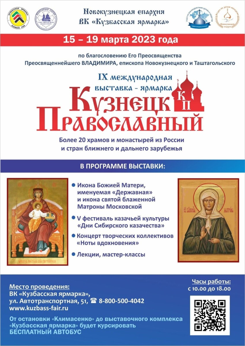 С 15 по 19 марта 2023 года в выставочном комплексе «Кузбасская ярмарка» пройдет IX Православная выставка-ярмарка «КУЗНЕЦК ПРАВОСЛАВНЫЙ», посвященная 375-летию монашеского служения на земле Кузнецкой.