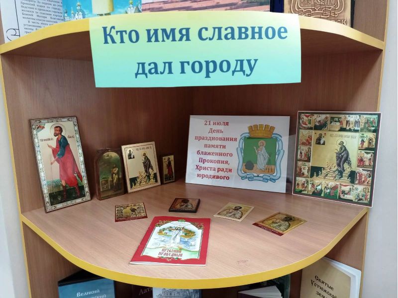 На выставке представлены редкие материалы о чудотворце, переданные в дар Александрой Петровной Рахмановой. Это иконы, электронные материалы, книги и альбомы о Прокопии и Великом Устюге.