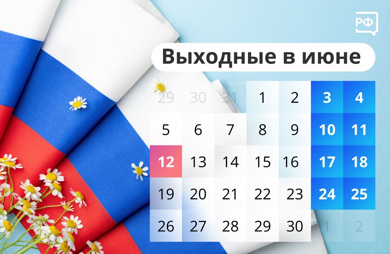 День России, 12 июня, в этом году выпадает на понедельник, поэтому будет три выходных подряд. В карточке ниже — календарь нерабочих дней