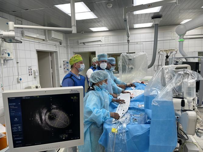 Успешное вмешательство выполнили Роман Сергеевич Тарасов, д.м.н. заведующий лабораторией рентгенэндоваскулярной и реконструктивной хирургии сердца и сосудов, Никита Александрович Кочергин, к.м.н. заведующий лабораторией тканевой инженерии и внутрисосудистой визуализации и Иван Владимирович Ганюков, рентгенэндоваскулярный хирург отделения ренгенхирургических методов диагностики и лечения.