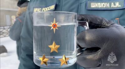 На этот раз флешмоб организовали сотрудники МЧС. Несколько человек встали в круг и одновременно вылили кипяток на мороз. Сверкающие брызги образовались мгновенно. На снятые ролики наложили музыку и получился настоящий клип.