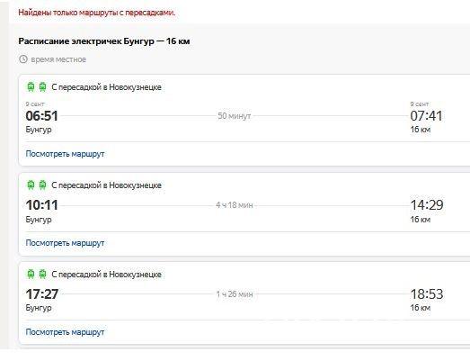 При том, что от Бунгура до вокзала 3 электрички в день, а с вокзала до «Берёзки» — только 6. Нет ни одной сквозной электрички, чтобы доехать без пересадок. Из всех пересадок адекватное время на пересадку только один раз в день — семь минут утром, в 7 часов.
