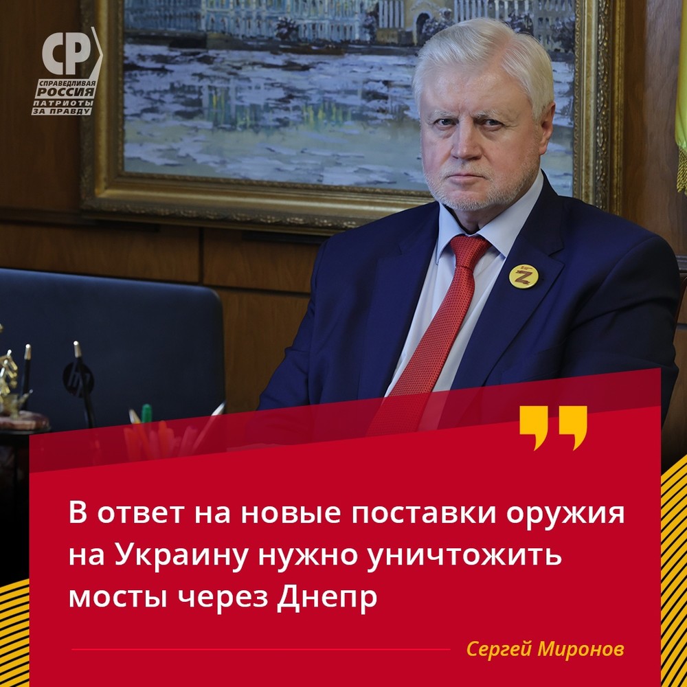 "Как только эта "помощь" прибудет на Украину, ее сразу погонят в Донбасс, для возвращения "своих" территорий. Масштабное наступление как воздух необходимо режиму Зеленского и всем сторонникам войны. Сорвать его в наших силах. Но для этого Россия должна нанести удары по мостам через Днепр и по другим стратегическим объектам. Это будет определяющий шаг для успеха всей специальной военной операции", – уверен заявил Председатель Социалистической партии "СПРАВЕДЛИВАЯ РОССИЯ – ПАТРИОТЫ – ЗА ПРАВДУ", руководитель фракции "СПРАВЕДЛИВАЯ РОССИЯ – ЗА ПРАВДУ" в Государственной думе РФ Сергей Миронов.