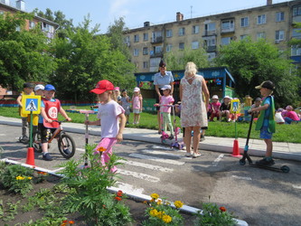 Ребята разделились на тех, кто играл роль пешеходов, водителей, были и пешеходы с самокатами. На импровизированной разметке во дворе детского сада ребятам нужно было найти место перехода, правильно выполнить весь порядок действий – остановиться, сойти с самоката, посмотреть по сторонам и только потом начать переход.