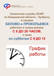Напоминаем, что клиентские службы ОСФР по Кемеровской области – Кузбассу в г. Белово и в Центральном и Зенковском районах г. Прокопьевска работают в будни на три часа дольше обычного – с 08. 00 до 20.00 и в субботу – с 09.00 до 15.00 .