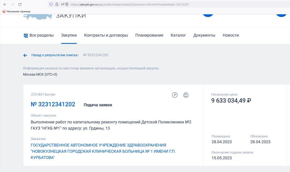 Новокузнецкая городская больница №1 имени Курбатова разместила конкурсную документацию на ремонт детской поликлиники по ул.